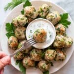 A white plate is filled with about fifteen small round meatballs that have a light brown color mixed with bright green herbs, giving them a fresh look. The meatballs show a moist and soft texture with bits of green herbs visible on every piece. In the middle of the plate, there is a white bowl filled with creamy white dipping sauce marked with small green herb pieces. A silver fork held by a woman's hand is lifting one meatball halfway out of the sauce, showing the meatball coated slightly in the sauce. Fresh green herb leaves and sprigs are scattered lightly around the meatballs and on the white marbled surface below the plate, adding a pop of natural green color around the dish. photo taken with an iphone --ar 4:5 --v 7