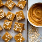 The image shows five square bars of orange-colored dessert with a smooth texture topped with scattered oat flakes, arranged on a baking tray lined with parchment paper. The bars are evenly cut with one piece slightly pulled away from the group. To the right of the tray, there is a white bowl filled with thick, creamy orange puree with a swirled pattern on top. Around the bowl and tray on a white marbled surface, there are loose oat flakes scattered casually. The scene is lit softly, highlighting the creamy and textured details of the dessert and oats. photo taken with an iphone --ar 4:5 --v 7