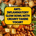 Indulge in a vibrant, nutritious experience with this Anti-Inflammatory Glow Bowl featuring quinoa, roasted sweet potatoes, crispy turmeric chickpeas, fresh baby spinach, avocado slices, and a creamy tahini yogurt sauce. Perfect for brunch or a quick weeknight dinner, this Mediterranean-inspired bowl offers a beautiful balance of flavors, textures, and antioxidant-rich ingredients that promote health and vitality.
