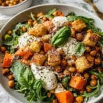 Indulge in a vibrant, nutritious experience with this Anti-Inflammatory Glow Bowl featuring quinoa, roasted sweet potatoes, crispy turmeric chickpeas, fresh baby spinach, avocado slices, and a creamy tahini yogurt sauce. Perfect for brunch or a quick weeknight dinner, this Mediterranean-inspired bowl offers a beautiful balance of flavors, textures, and antioxidant-rich ingredients that promote health and vitality.