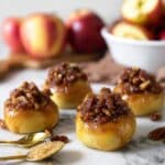 Keywords: baked apples, Honeycrisp apples, pecan topping, brown sugar crumble, warm dessert, caramel sauce, fall dessert