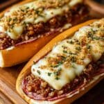 These Baked Italian Sub Sandwiches combine layers of savory salami, spicy capicola, fresh mozzarella, and provolone cheeses with tangy banana peppers, all toasted to perfection inside hoagie rolls. Perfect for a hearty lunch or casual dinner, baked until bubbly and golden for a warm and melty deli-style experience at home.