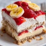 - Add the Toppings: While the cake is cooling, whip the heavy cream into soft peaks or prepare the whipped topping if using store-bought. Spread or dollop the whipped cream over the cooled cake generously. Garnish with additional sliced bananas, fresh strawberries, and chopped pecans or walnuts for added texture and flavor. Optionally, drizzle chocolate syrup or melted chocolate over the top to complete the banana split theme.