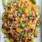 - Garnish & Serve: Remove from the oven and drizzle with additional BBQ sauce and bleu cheese dressing. Top with diced tomatoes, minced red onions, pickled onions, and fresh cilantro if desired.