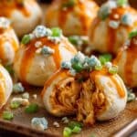 Cheesy Buffalo Ranch Chicken Bombs are a flavorful, easy-to-make appetizer featuring shredded chicken mixed with cream cheese, buffalo sauce, cheddar cheese, ranch dressing, and green onions, all wrapped in crescent roll dough and baked until golden brown. Perfect for game day or parties, these bite-sized treats combine spicy, creamy, and cheesy flavors in every delicious bite.