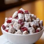 Cherry Cheesecake Puppy Chow is a delightful and easy-to-make snack that combines crunchy Chex cereal coated in a smooth, cherry-flavored white chocolate mixture and dusted with a sweet cheesecake pudding and powdered sugar blend. Enhanced with dried cherries, this treat offers a perfect balance of creamy, fruity, and crunchy textures, ideal for parties, movie nights, or anytime you crave a sweet and fun snack.