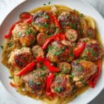 Chicken Scarpariello is a flavorful Italian-American dish featuring tender bone-in chicken thighs and spicy Italian sausage simmered together with pickled cherry peppers, garlic, and bell peppers in a tangy white wine and chicken stock sauce. This rustic skillet meal offers a perfect balance of savory, spicy, and tangy flavors, ideal for a hearty family dinner.