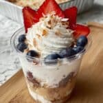 A clear cup holds a layered dessert with a base of light brown cake or brownie pieces, followed by a layer of white creamy filling with visible toasted coconut flakes mixed in. On top of this, there is a thick swirl of white whipped cream, decorated with fresh bright red strawberry slices and plump dark blue blueberries scattered around the cream. Toasted coconut flakes are sprinkled over the whipped cream. The dessert sits on a wooden surface with a white marbled texture in the background, and an aluminum foil tray of baked dessert can be seen blurred behind it. photo taken with an iphone --ar 4:5 --v 7