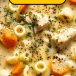 This creamy chicken noodle soup with mini croutons is a comforting and hearty dish perfect for any season. Tender chicken breast, crispy bacon bits, and crunchy homemade croutons complement a rich, creamy broth loaded with vegetables, pasta, and sweet corn. The soup balances textures and flavors beautifully, making it a delightful meal for family or guests.