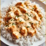 - Step 8: Serve the chicken and creamy sauce over cooked white rice. Garnish with fresh chopped parsley before serving.