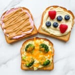 The image shows three toasted bread slices with different toppings, placed on a white marbled texture. The top-left slice is covered with a light pink spread and drizzled with a creamy peanut butter layer, creating a smooth and slightly glossy finish. The top-right slice has a creamy pale yellow spread topped with fresh berries: two red raspberries and four dark blueberries, adding bright color and texture contrast. The bottom slice is topped with a cheesy, creamy mixture that includes small green broccoli pieces and melted orange-yellow cheese, creating a textured and colorful layer. The edges of all the bread slices are golden brown, slightly crisp. photo taken with an iphone --ar 4:5 --v 7