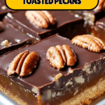 - Step 4: Remove from the oven and let cool for 10 minutes. Melt the chocolate chips in 30-second intervals, stirring between each, until smooth. Pour the melted chocolate over the caramel layer and spread to create a glossy finish. Decorate with extra pecans if desired.
