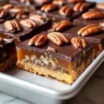 Decadent Turtle Bars feature a buttery shortbread crust, rich homemade caramel loaded with toasted pecans, and a luscious chocolate topping. This classic dessert combines textures and flavors for a sweet, crunchy, and gooey treat perfect for any occasion.