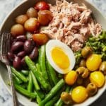 A classic French Niçoise Salad featuring perfectly boiled eggs, tender potatoes, blanched green beans, and oil-packed tuna, all brought together with a tangy, garlicky sherry vinaigrette. This hearty and flavorful salad is perfect for a light lunch or elegant dinner.