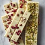 This easy homemade vegan white chocolate recipe combines creamy cacao butter, coconut butter, and cashew butter with natural vanilla and powdered sugar to create a luscious, plant-based treat. Enhanced with optional toppings like pistachios or freeze-dried raspberries, this recipe is perfect for anyone looking to enjoy dairy-free white chocolate that’s simple, delicious, and delightful to make at home.