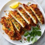 6. Serve: Remove from the oven, garnish with fresh parsley and a squeeze of lemon juice if desired. Serve immediately and enjoy your delicious, crispy oven-baked chicken cutlets.
