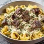 Keywords: Garlic steak tortellini, creamy pasta, steak bites, Parmesan cream sauce, easy dinner, comfort food