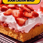 - Assemble the Dessert: When ready to serve, spread half the strawberry mixture with juices evenly over the cooled shortcake. Dollop and spread the sour cream whip over the strawberries, creating peaks and valleys. Spoon the remaining strawberries and juices on top. Slice and serve immediately.