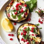 Keywords: grilled eggplant, yoghurt sauce, Middle Eastern, vegetarian, healthy side dish, pomegranate seeds, tahini sauce