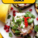 A flavorful and healthy grilled eggplant recipe served with a creamy yoghurt sauce enhanced with cumin, tahini, lemon juice, and fresh herbs, garnished with pomegranate seeds and red chili for a refreshing Middle Eastern-inspired dish.
