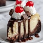 Keywords: brownie cheesecake, hot fudge sundae, layered cheesecake, chocolate dessert, indulgent dessert, homemade cheesecake, fudgy brownie