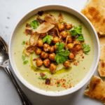This Hummus Soup With Crispy Chickpeas is a comforting and flavorful dish that combines creamy pureed chickpeas with aromatic spices, garlic, and fresh herbs, topped with crunchy pan-fried chickpeas for a delightful texture contrast. It’s easy to prepare on the stovetop, perfect as a warming meal or appetizer, and can be served with pita chips for added crunch.