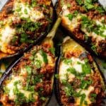 7. Bake Stuffed Eggplants: Return the stuffed eggplants to the oven and bake them for an additional 15–20 minutes, until the tops are golden brown and the filling is heated through.