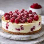 This indulgent White Chocolate Raspberry Cheesecake blends creamy white chocolate-infused cheesecake with a buttery graham cracker crust and swirls of fresh raspberry sauce, creating a luscious dessert perfect for special occasions or a decadent treat.