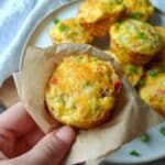 A close-up image shows a yellow and orange mini muffin with visible bits of red and green vegetables or herbs baked inside, held by a woman's hand wrapped in a light brown paper napkin. The muffin has a slightly rough textured top with melted cheese and small browned spots. In the background, multiple similar mini muffins are placed on a white plate with some green herbs sprinkled on them. The setting is on a white marbled surface. photo taken with an iphone --ar 4:5 --v 7