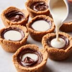 5. Prepare and Pour Filling: In a small glass or bowl, combine 1/3 cup whole milk with 3 tablespoons Baileys Irish Cream, stirring gently. Pour this creamy mixture into each chocolate-lined cookie cup just before serving to prevent sogginess.