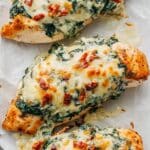 This Oven Baked Chicken Breasts recipe features tender, thinly sliced chicken breasts topped with a creamy mixture of spinach, cream cheese, cheddar, and sun-dried tomatoes, baked to perfection for a flavorful and easy dinner option.
