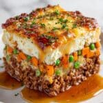 A thick square slice of layered casserole sits on a white plate against a white marbled surface, showing three main layers. The bottom layer is dense ground beef with a rich brown color and juicy texture. Above that is a colorful layer of diced vegetables including bright orange carrots and green peas mixed with melted cheese, which stretches slightly down the sides. The top layer is golden brown melted cheese with a bubbly, slightly crispy texture, scattered with finely chopped green herbs. The melted cheese drips slightly down the edges, creating a glossy look, and a small pool of sauce surrounds the bottom on the plate. Photo taken with an iphone --ar 4:5 --v 7