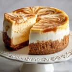 - Serve: Carefully remove the cheesecake from the springform pan. Garnish with optional whipped cream, caramel drizzle, and crushed pecans or walnuts before serving for an extra touch of flavor and texture.