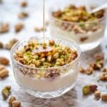 Rose Water Pudding is a fragrant and creamy dessert made with milk, aromatic rose and orange blossom waters, thickened with cornstarch, and garnished with a mix of nuts. Served chilled with a delicate rose water simple syrup, this pudding offers a harmonious balance of floral notes and nutty textures, perfect for an elegant treat.