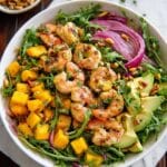 Store the salad in an airtight container in the refrigerator for up to 1 day. The avocado may brown over time, so it’s best eaten fresh. If preparing ahead, keep shrimp separate and add just before serving. Reheat shrimp gently in a pan if desired.