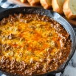 This Sloppy Joe Dip is a hearty, flavorful appetizer that combines seasoned ground beef with bell peppers, onions, and a blend of spices, all topped with melted cheddar cheese. Perfect for parties or casual gatherings, this dip is served warm with crispy baked baguette slices or Fritos, offering a delicious twist on the classic Sloppy Joe sandwich in a shareable dip form.