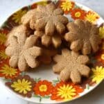 A white plate with a colorful border of bright orange, yellow, and brown flowers holds a pile of light brown, flower-shaped cookies. The cookies have a rough texture with a slightly crumbly surface and are stacked in two layers, some resting flat while others lean against each other. The background is a white marbled texture. photo taken with an iphone --ar 4:5 --v 7