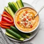 Store the dip in an airtight container in the refrigerator for up to 3 days. Before serving, give it a good stir. This dip is best served cold but can be brought to room temperature if preferred.