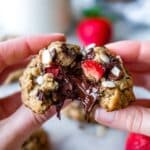 A close-up view of a broken cookie held by two woman's hands, showing a gooey melted dark chocolate center with chopped nuts and pieces of red strawberry embedded in the crumbly light brown cookie dough; one half of the cookie displays visible soft red strawberry bits and the other half shows melted chocolate stretching between the two parts; in the blurred background a white cup and a whole fresh strawberry lie on a white marbled surface. Photo taken with an iphone --ar 4:5 --v 7