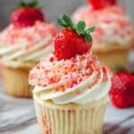 - Add Topping and Strawberries: Sprinkle the strawberry crunch topping generously over the frosted cupcakes. Top each cupcake with a fresh sliced strawberry for a fresh and colorful finish.