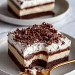 A square dessert is on a white plate with four layers visible: a dark brown bottom layer that looks dense and moist, above it a thick creamy light beige layer, then a smooth dark chocolate layer, and finally a thick white whipped layer on top sprinkled with small curled chocolate shavings. A gold fork holds a small bite-sized piece showing all the layers clearly. Another plate with a similar dessert is blurry in the background, all set on a white marbled texture. photo taken with an iphone --ar 4:5 --v 7