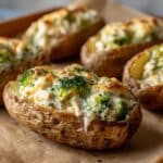 Store leftover twice baked potatoes in an airtight container in the refrigerator for up to 2 days. Reheat in a preheated oven at 180°C / 350°F until warmed through and the cheese is bubbly again. Avoid microwaving to maintain crispiness.